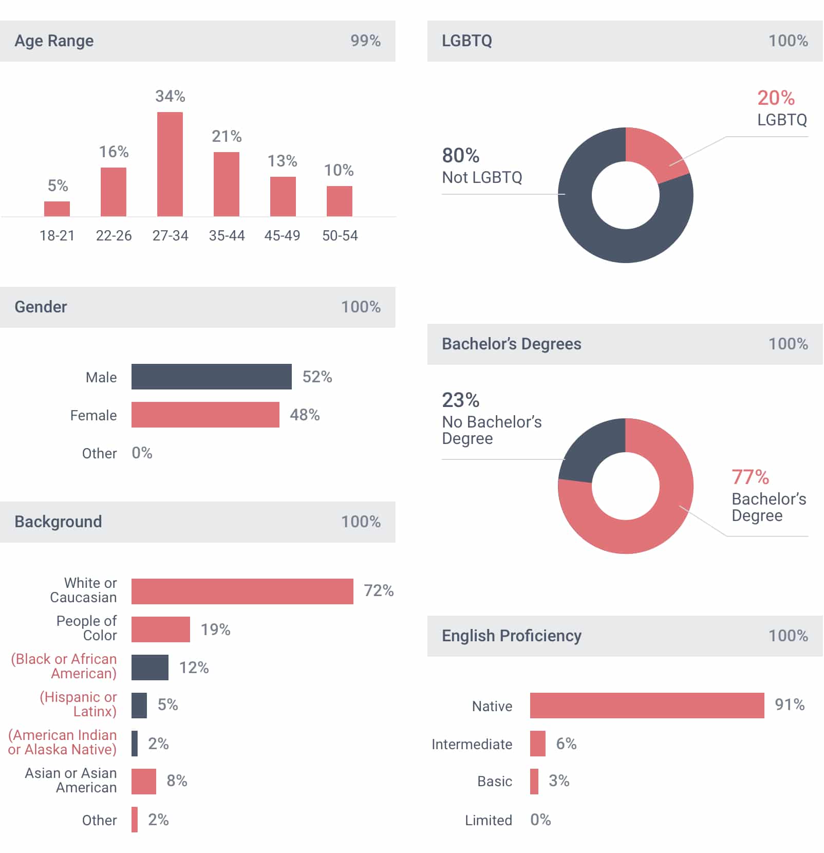 The demographics of our participants aren’t exactly a finding, but we want to include them here because they’re interesting. In short, we were pleasantly surprised to find such a diverse group of individuals. Here they are:
