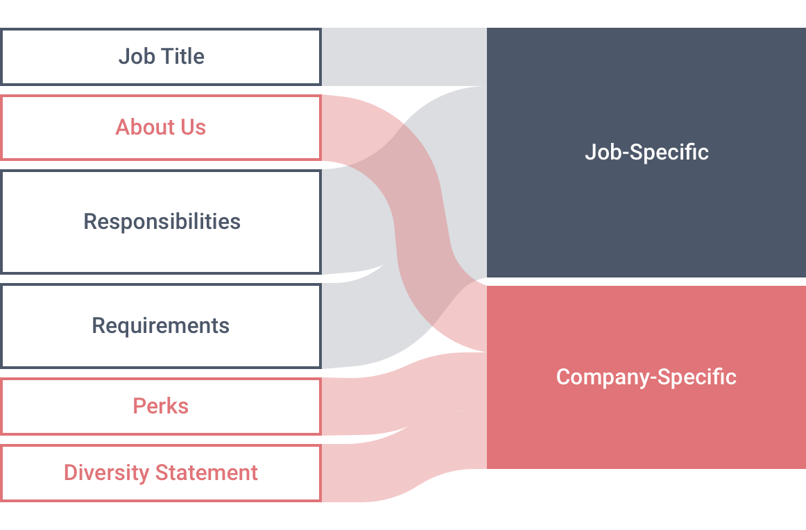 Another limitation has to do with job description content. Job descriptions have two main types of content: job-specific and company-specific. Job-specific content includes the title, responsibilities, requirements, and descriptions of the team. Company-specific content includes benefits, perks, a description of the company, and a diversity and inclusion statement.