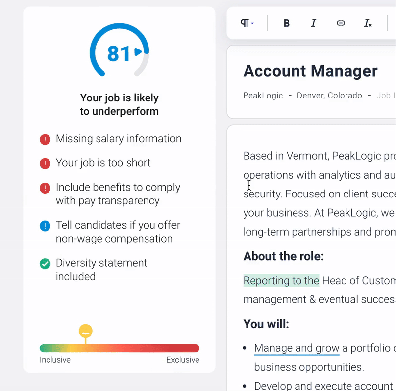 Our Smart Editor proactively alerts your team if a job post is missing required pay or benefits information based on the job’s location. If your role is posted in California, for example, Datapeople will flag the need to include salary ranges and material benefits. This eliminates guesswork and protects you from accidental non-compliance.