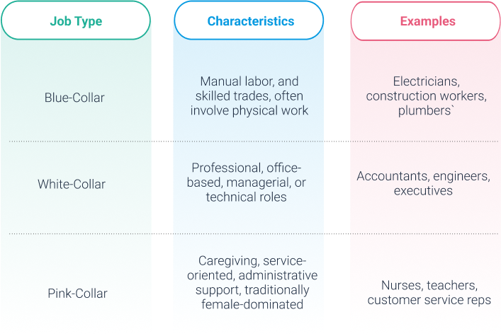 To better understand pink-collar jobs, it’s useful to compare them to their blue- and white-collar counterparts:
