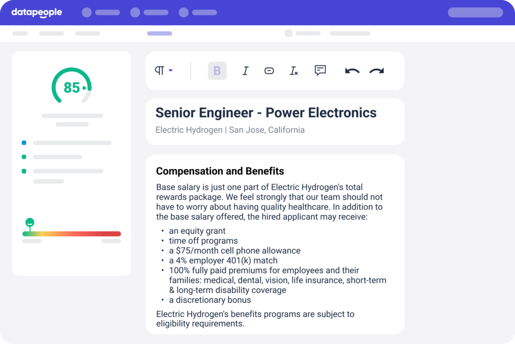 Headquartered in Massachusetts, Datapeople customer Electric Hydrogen is revolutionizing renewable energy and the fight against climate change by manufacturing the world’s most powerful electrolyzers. Their recent job listing for an electrical engineer scored highly. Datapeople’s Smart Editor combines everything hiring teams need to know about job content into a single predictive score. In our review, our experts (and platform) were particularly impressed with Electric Hydrogen’s benefits section, shown below.