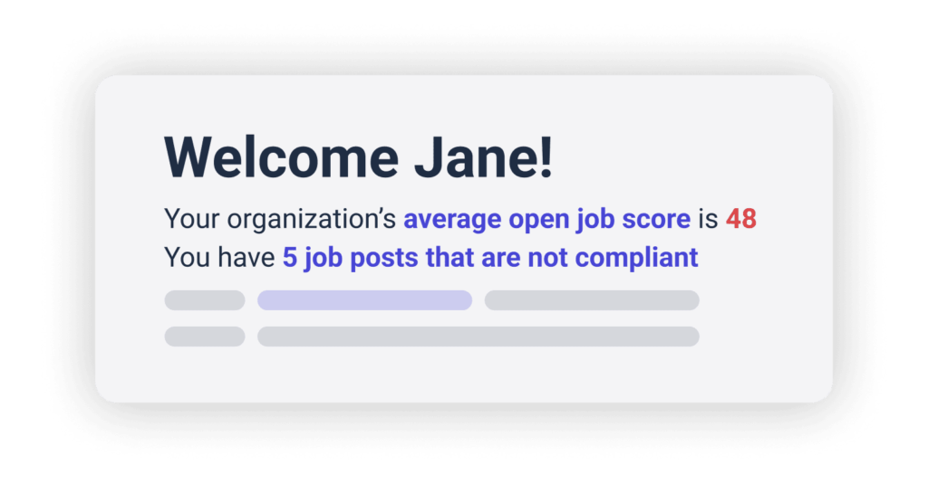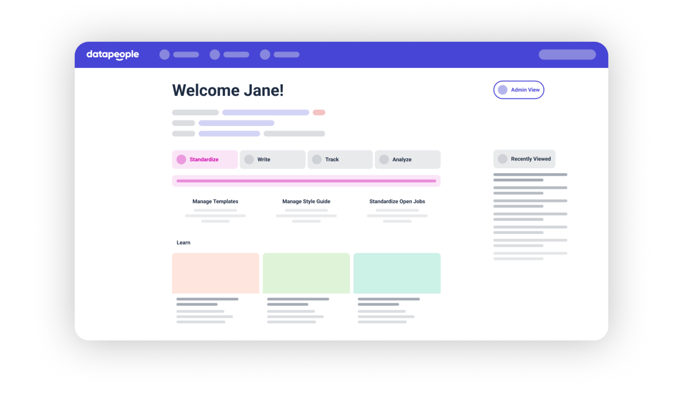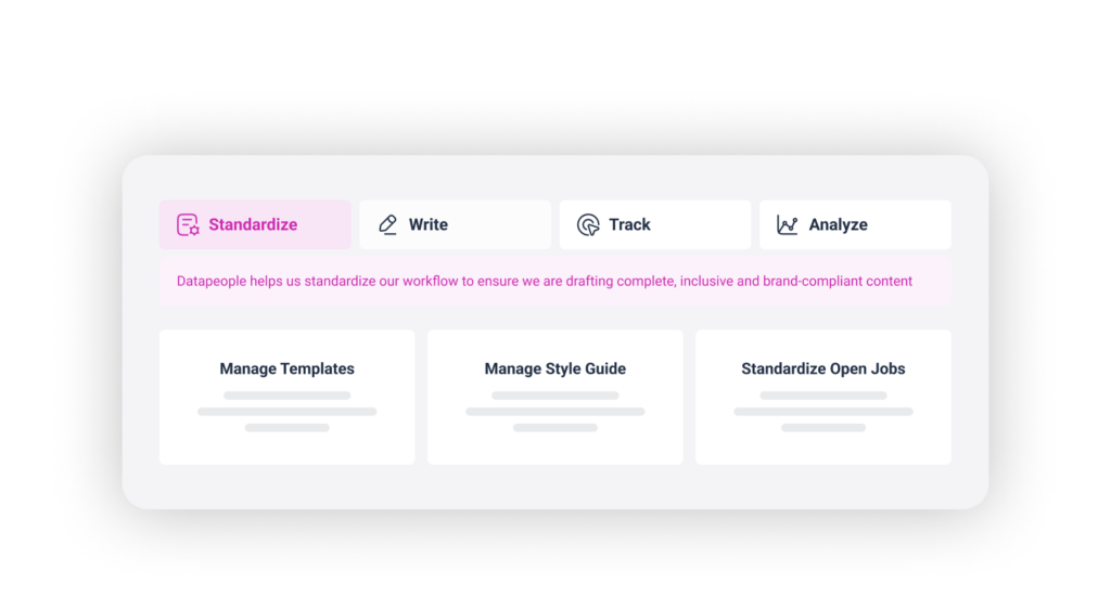 Specific to your assigned user type, Admin or Editor, you’ll be greeted with a customized view of your core recruitment actions, including recent job posts, presented in one place. From optimizing a new job post to verifying job post compliance to analyzing pipeline data, simply toggle between core Datapeople actions – Standardize*, Write, Track, and Analyze – to take swift action, simplify your workflows, and bake data into every stage of the hiring process.